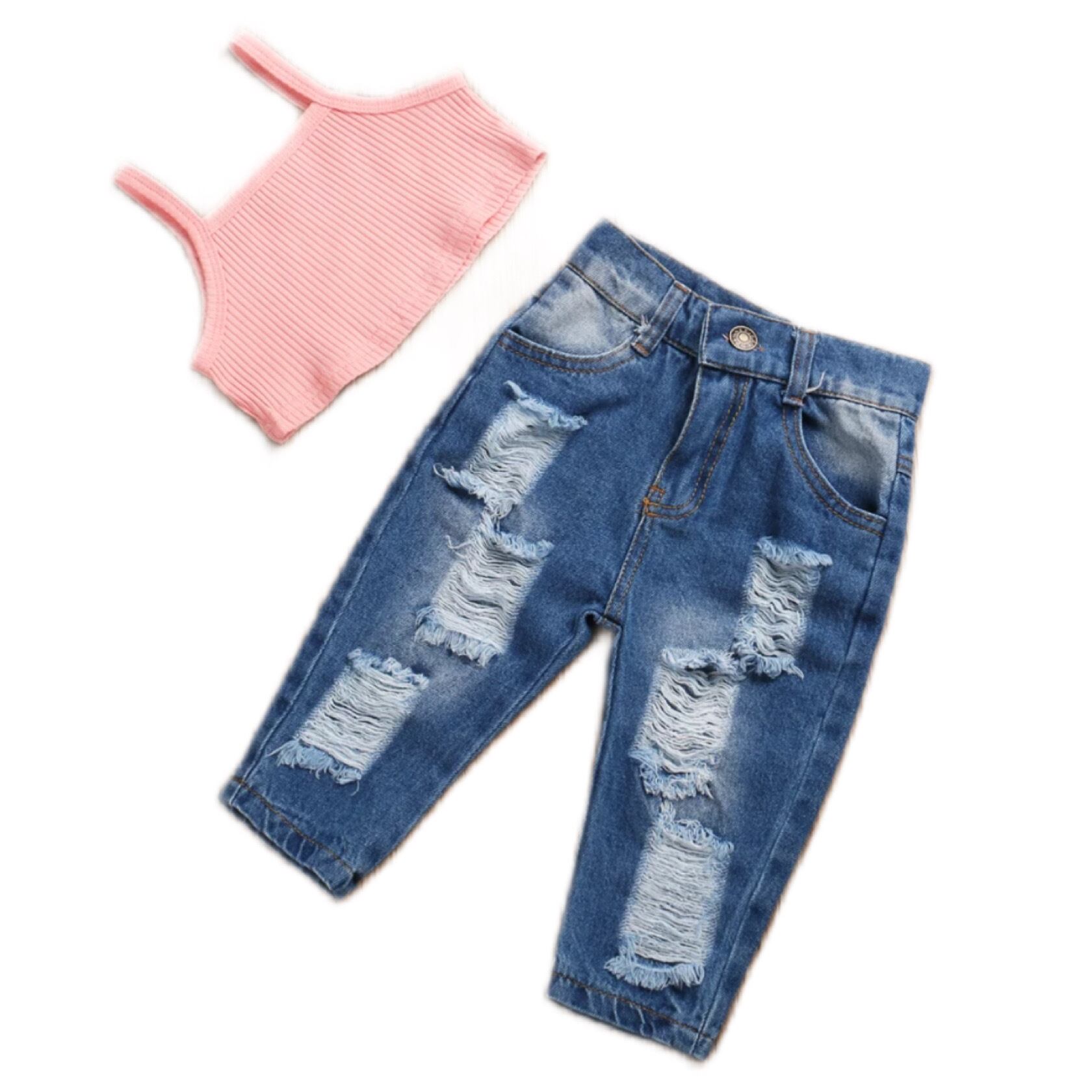 クロップド丈キャミソール&クラッシュデニムパンツの2点セット。