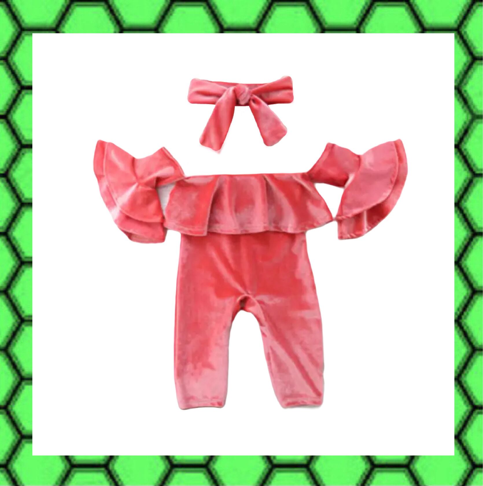 ベロア素材オフショルダーロンパース&リボンの2点セット。